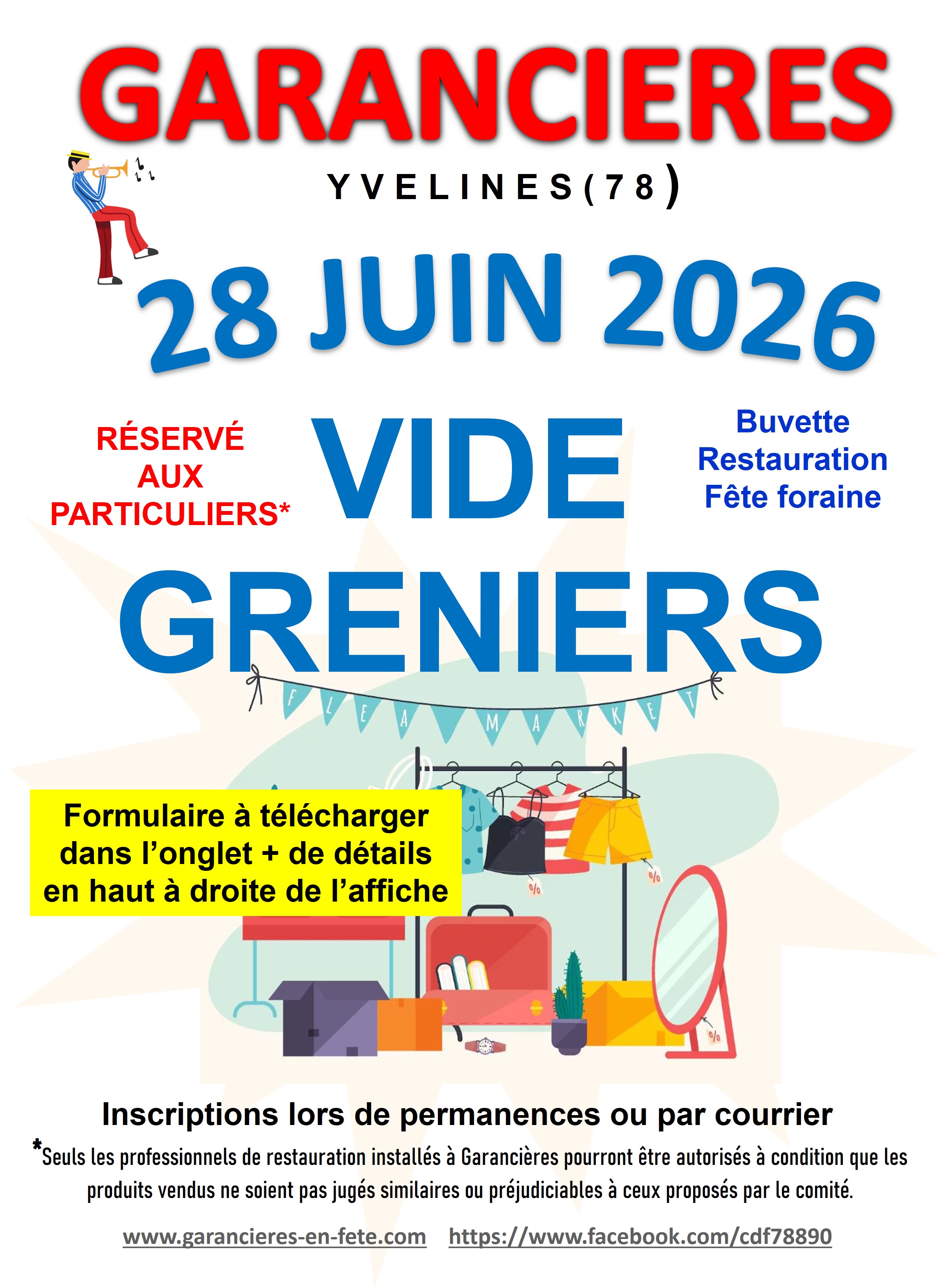 - soit en téléchargeant le formulaire ci-dessous et en le renvoyant complété à l'adresse suivante : Comité des Fêtes - mairie de Garancières - Rue saint Pierre - 78890 GARANCIERES. Votre envoi devra comporter également la photocopie d'une pièce d'identité et votre règlement par chèque à l'ordre du Comité de Fêtes de Garancières (merci d'écrire lisiblement votre adresse mail ainsi que votre n° de téléphone, votre n° d'emplacement vous sera communiqué par ce biais)